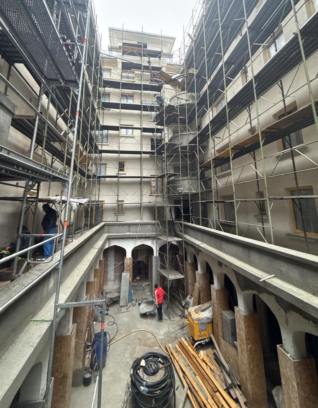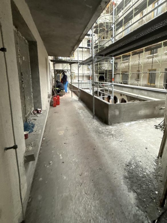 - la etajul 5: montarea primului strat de vată minerală și a elementelor metalice pentru susținerea acoperișului; protejarea tâmplăriei exterioare în vederea lucrărilor de torcretare.