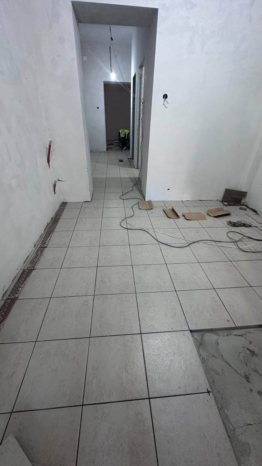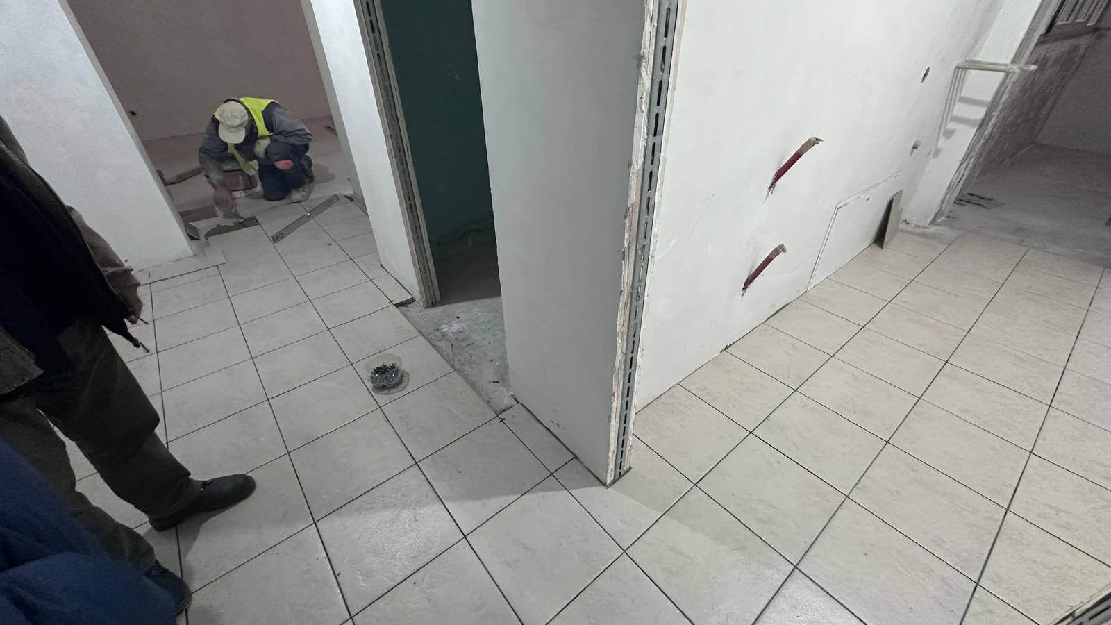 În paralel, pe întreg șantierul se asigură aprovizionarea cu materiale necesare etapelor de execuție: glet, gresie și adezivi, acestea fiind distribuite pe etaje în funcție de necesități. Totodată, continuă evacuarea deșeurilor rezultate din lucrările de construcții.